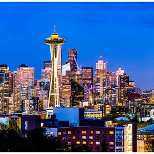 SEATTLE SKYLINE SPECTACULAR PANORAMA HANDCRAFTED POSTCARDs PRINT. 11 X 4 INCHES. NEW. Set of two postcards. This is excellent choice to add these postcards to your collection. They are also a great gift to anyone. These images received with capturing a numerous frames with my Nikon D750. Then they were stacked together. The picture were taken from Kerry Park Lookout. You can see the main symbol of Seattle there on the center. The Space Needle is located in Seattle, Washington, the traditional territory of the Coastal Salish and Duwamish people.